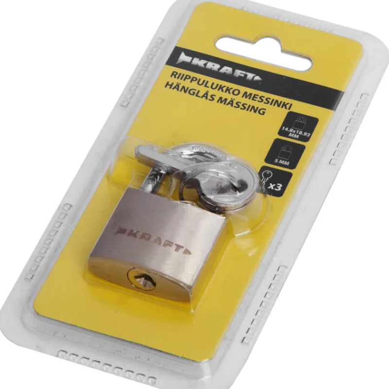 Kraft-riippulukko messinkiä, sangan pituus 30 mm. Lukon mitat: 30 x 27,5 x 12,5 mm, paino 74 g. Mukana kolme nikkelipinnoitettua avainta.