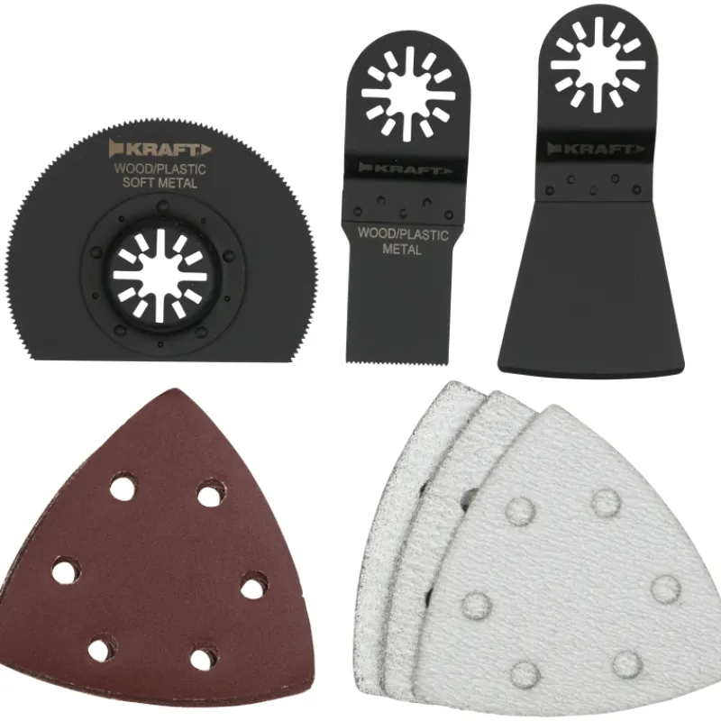 Kraft Multitool Hiomapaperi-Teräsarja sopii useimpiin markkinoilla oleviin monitoimityökaluihin. 13-osaisessa pakkauksessa on hiomapapereita 90 mm 4 x P60, 4 x P120, 2 x P240, segmentti-sahanterä 88 mm, metalli-sahanterä 28,5 mm, taipuisa kaavinterä 52 mm.