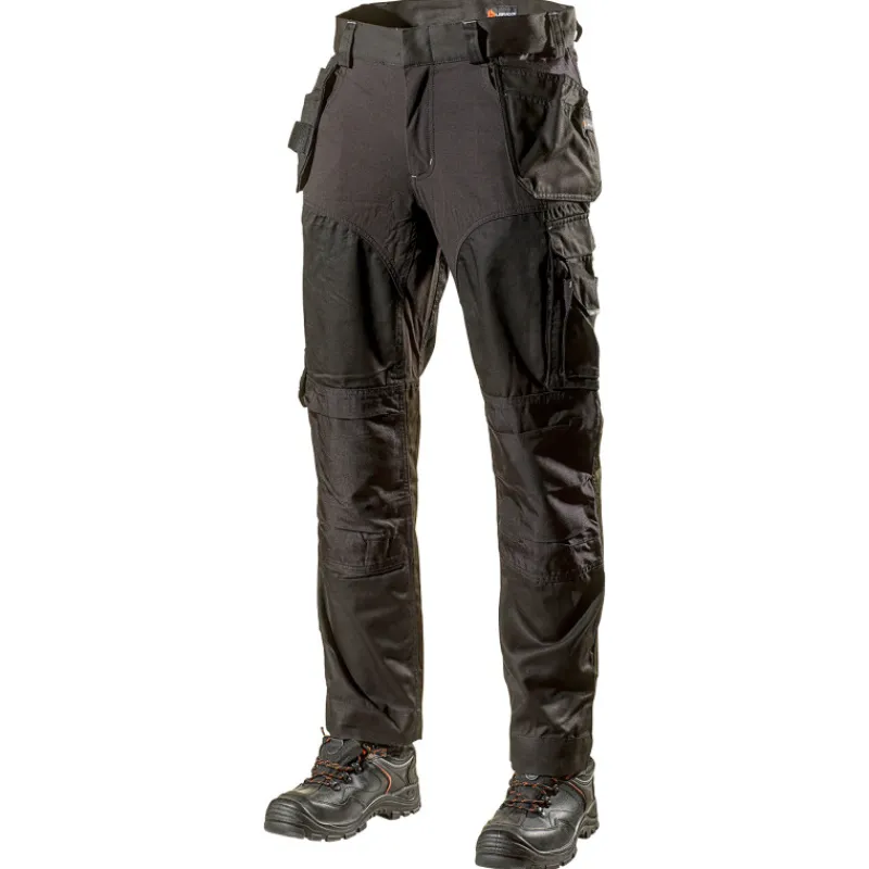 Joustavat työhousut, joissa mukava istuvuus ja korkea laatu sekä irrotettavat riipputaskut ja taskut polvisuojia varten. Housut kuuluvat No-Scratch-tuotesarjaan, jonka vaatteet eivät naarmuta arkoja työkappaleita, koska niiden metalliosat on suojattu huolellisesti. Riipputaskut ja polvitaskut on vahvistettu Cordura-stretch-materiaalilla.