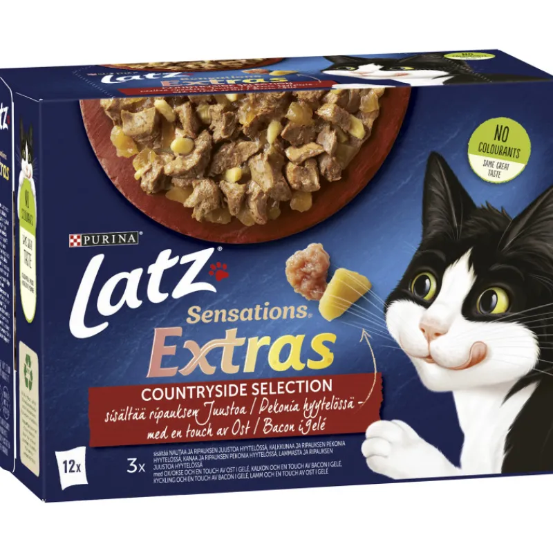 Latz Sensations Extras -täysravintoannokset ovat astetta juhlavampia aterioita, sillä niissä on mukana ripaus juustoa tai pekonia. Laadukkaista raaka-aineista valmistetut kerta-annokset sisältävät mureita paloja erimakuisissa hyytelöissä. Upeat makuyhdistelmät tyydyttävät kissan vaihtelunhalun ja antavat kissoille jotain mitä odottaa!