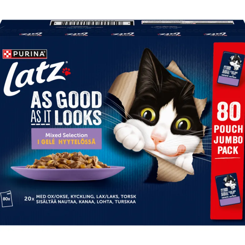 Latz As Good As It Looks -jumbopakkauksen ateriat näyttävät, tuoksuvat ja maistuvat yhtä herkullisilta kuin itse tehdyt. Laadukkaista aineksista valmistetut annokset sisältävät mureita paloja mehevässä hyytelössä. Ravinto on omega-6-rasvahappojen lähde ja sisältää oikean yhdistelmän tärkeitä vitamiineja, jotka tukevat kissan hyvinvointia.