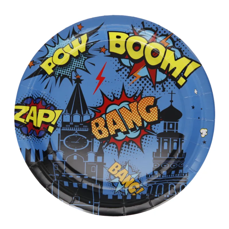 Supersankariteemaiset Let’s Party -kattaustuotteet sopivat täydellisesti pienen juhlasankarin herkkupöytään! Supersankari-kertakäyttölautasen halkaisija on 18 cm.