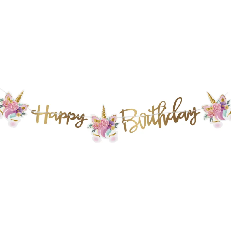 Yksisarvisteemainen Happy Birthday -koristenauha tuo taikapölyä syntymäpäiväjuhliin! Nauhan pituus on noin 3 metriä.