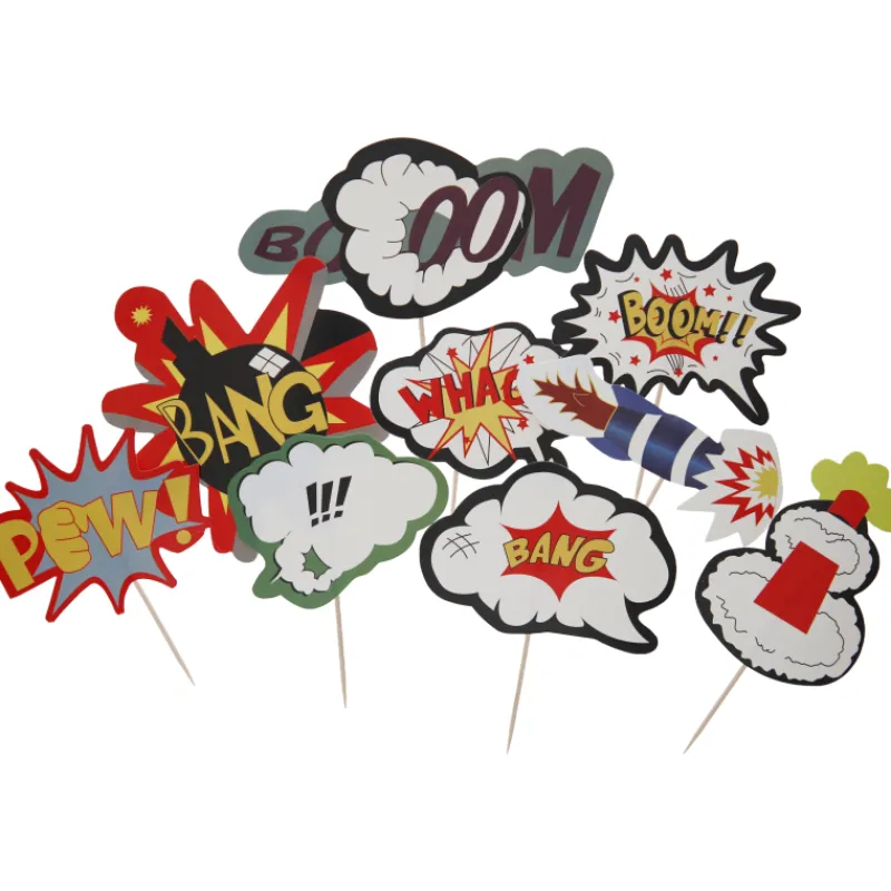 Sarjakuvatyyliset Let’s Party Supersankari -partytikut juhlakattaukseen. Pakkaus sisältää kahdeksan tikkua.
