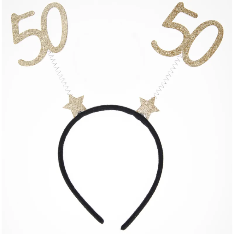 Kruunaa 50 vuotta täyttävä syntymäpäiväsankari Let’s Party -hupipannalla! Pannassa on juhlavan kullanvärisinä kimaltelevat tähti- ja numerokoristeet.