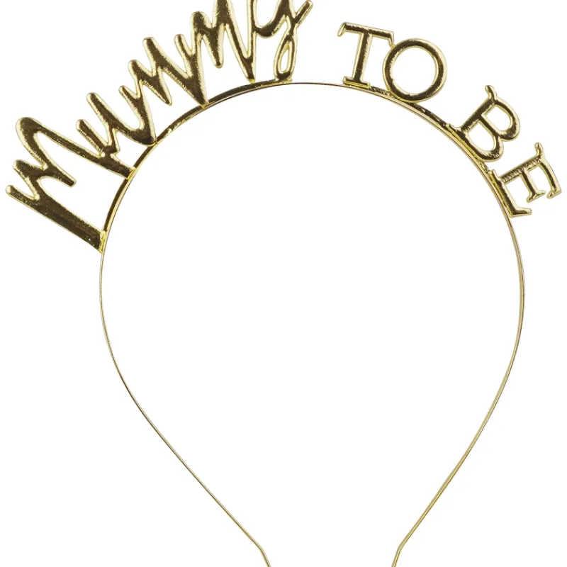 Let’s Party -hupipanta on hauska asuste baby shower -juhlien päätähdelle. Kullanväristä pantaa koristaa teksti ”Mummy to Be”.
