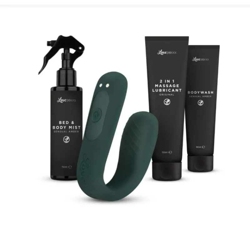 Moments by LoveBoxxx -seksilelusetti sisältää kaiken tarvittavan yhteiseen aikaan. Ylellinen huone- ja vartalotuoksu (150 ml) luo miellyttävää tunnelmaa ja suihkugeeli (150 ml) sopii yhteisiin pesuhetkiin. 2-in-1-hierontaliukuvoide (150 ml) soveltuu sekä hemmottelevaan hierontaan että liukuvoiteena käytettäväksi. Setin kohokohta on joustava parivibraattori, joka sisältää useita värinätiloja ja taipuu helposti C-muotoiseksi vibraattoriksi. Tyylikäs lelu on myös vedenpitävä, ja se ladataan mukana tulevalla USB-latauskaapelilla.
