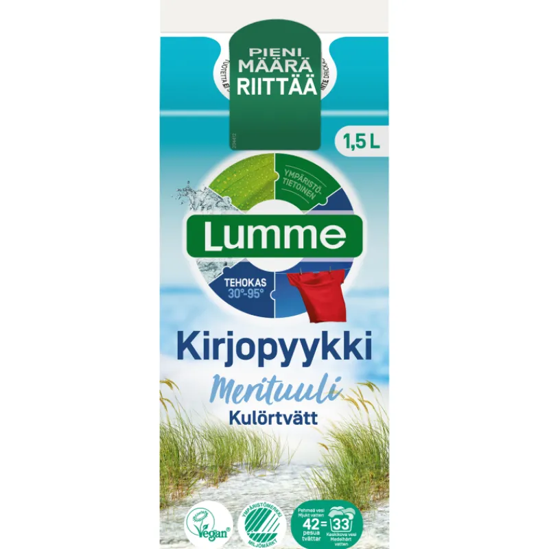 Lumme Kirjopyykki Merituuli on kirjopyykin pesuun erityisesti suunniteltu ja pehmeän merellisen tuoksuinen pesuneste. Se on hellävarainen pyykin väreille ja toimii jo 30 °C:ssa.