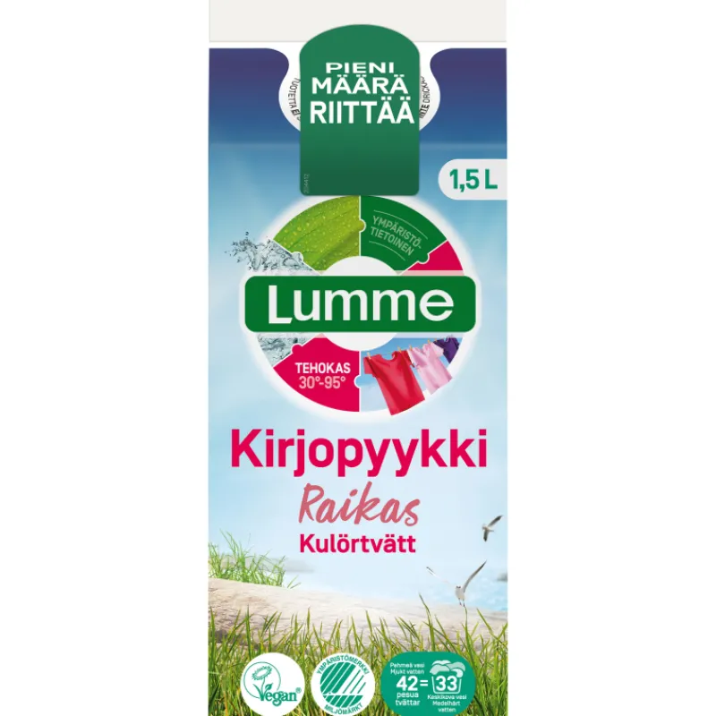 Lumme Kirjopyykki Raikas on kirjopyykin pesuun erityisesti suunniteltu ja pehmeän raikkaan tuoksuinen pesuneste. Se on hellävarainen pyykin väreille ja toimii jo 30 °C:ssa.