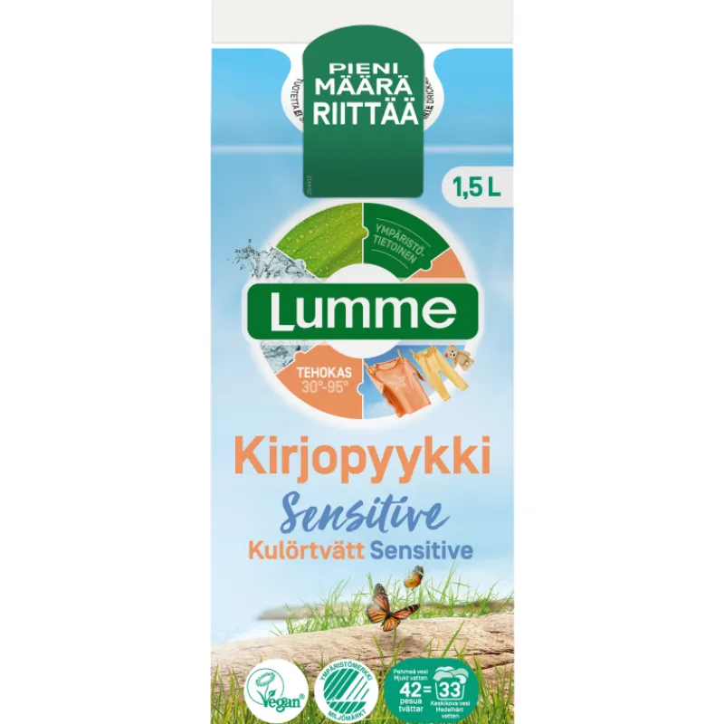 Lumme Kirjopyykki Sensitive on hajusteeton ja väriaineeton pyykinpesunestetiiviste. Se on hellävarainen pyykin väreille ja toimii jo 30 °C:ssa.