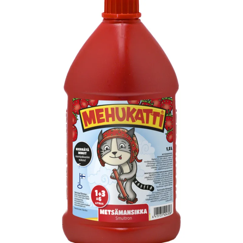 Mehukatti Metsämansikkajuomatiiviste on koko perheen janonsammuttaja. Yhdestä pullosta saa 6 litraa maistuvaa mehua. Helppo ottaa mukaan kotiin tai mökille! Sekoitussuhde 1 + 3.