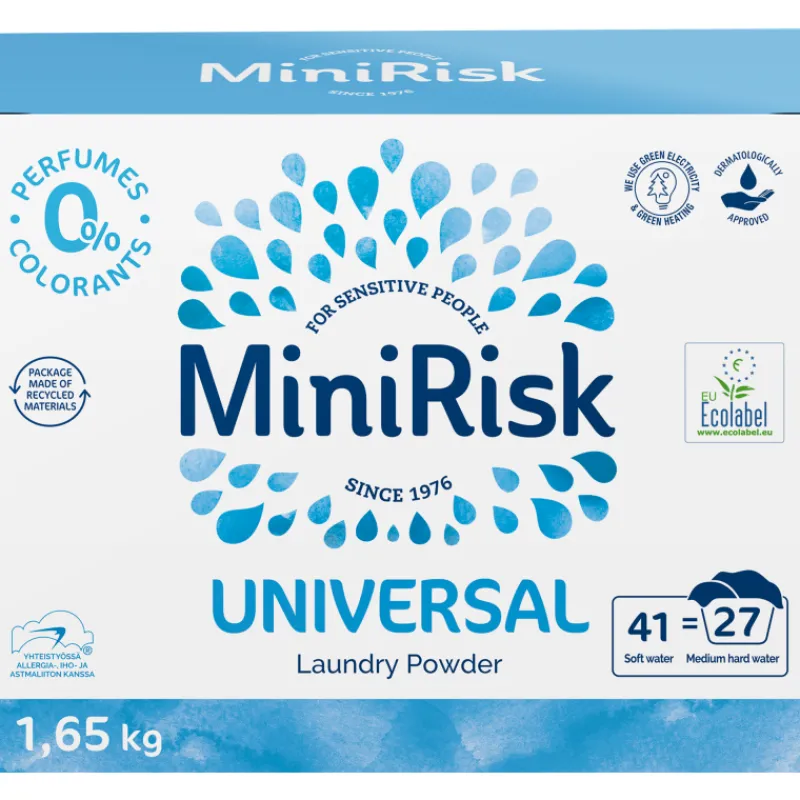 Hajusteeton Mini Risk Universal on vegaaninen ja väriaineeton pesujauhe, joka sopii erinomaisesti niin lapsiperheille, herkkäihoisille ja hajusteettomista pesuaineista pitäville. Se on kehitetty värillisten ja valkoisten vaatteiden pesuun pyykinpesukoneessa tai käsin +30C-+95C lämpötilassa. Käytä käsinpesussa suojakäsineitä. Riittoisa 1,65 kg:n pakkaus pesee noin 41 koneellista pyykkiä!