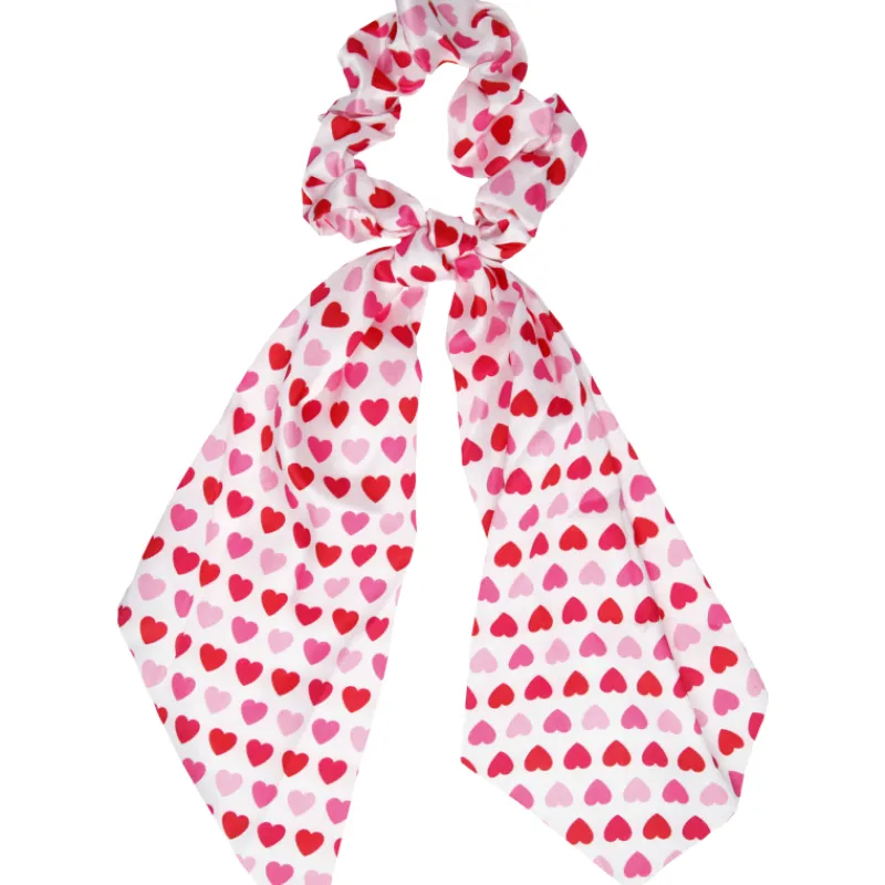 Huivisomisteinen hiusdonitsi on helppo ja nopea tapa lisätä näyttävyyttä kampaukseen. Huividonitsissa pirteä sydänprintti.