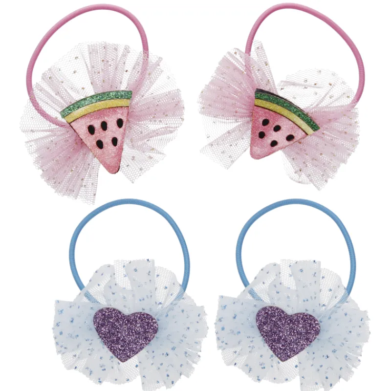 Vesimeloni- ja sydänkoristeiset hiuslenkit tuovat viehättävää tyyliä kampaukseen.