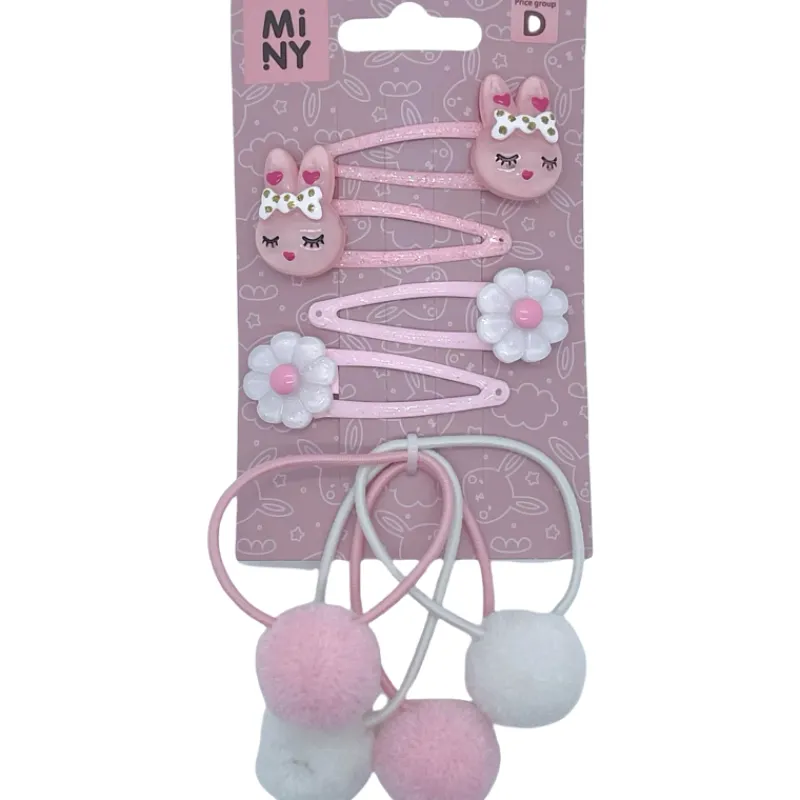 Sievä lasten hiussetti tuo väriä ja leikkisyyttä hiuksiin. Setissä on neljä hiuspinniä, joissa on söpöt pupu- ja kukkakoristeet sekä neljä hiuslenkkiä pompulalla.