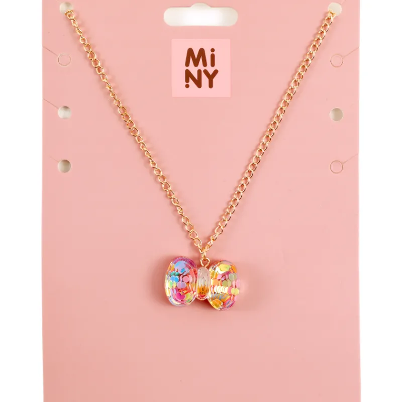 Lasten kokoa oleva Miny-kaulaketju pullealla rusettiriipuksella. Kullanvärisessä ketjussa on monivärinen rusettifiguuri. Nikkeli-vapaa.