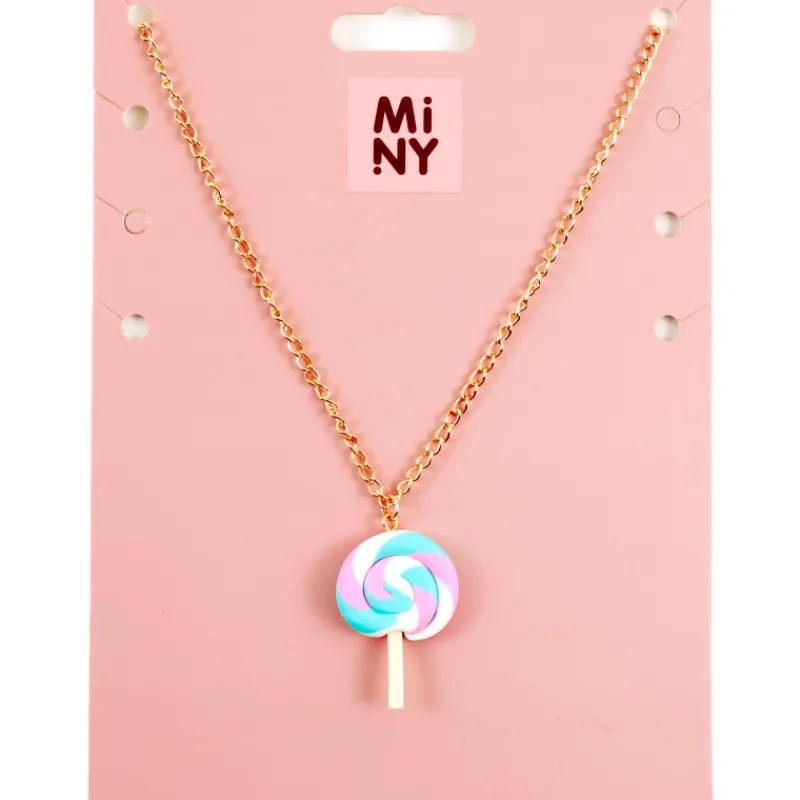 Lasten kokoa oleva Miny-kaulaketju kivalla tikkaririipuksella. Kullanvärisessä ketjussa on turkoosi/keltainen/lila tikkarifiguuri. Nikkeli-vapaa.
