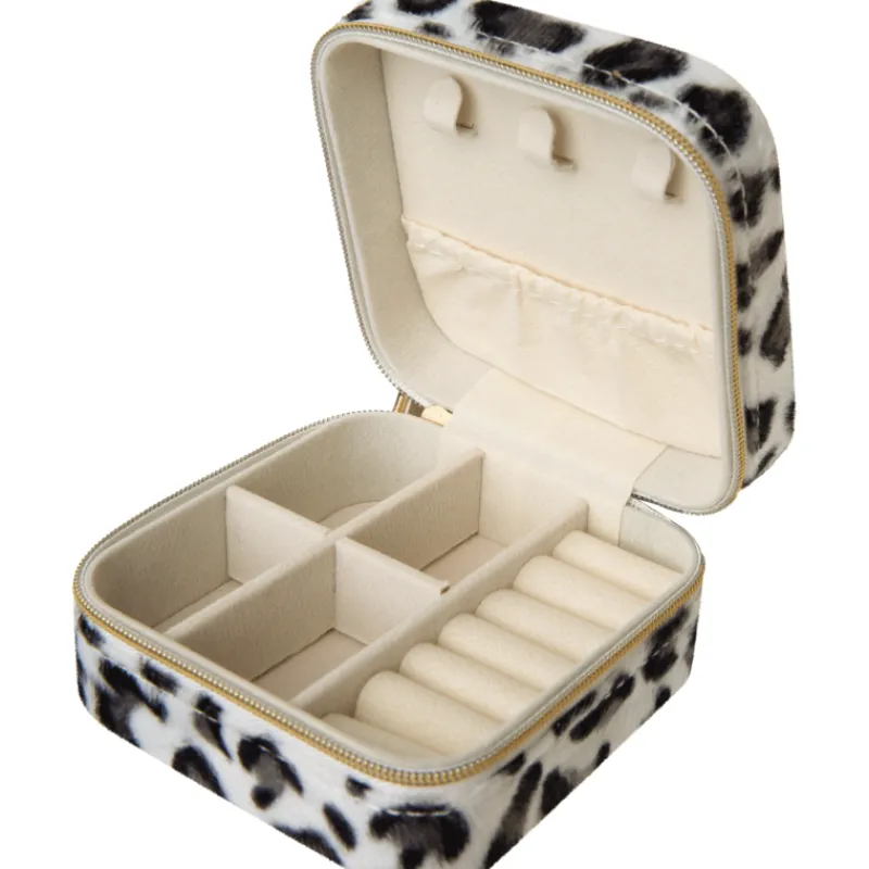 Samettisen pehmeä, leopardikuvioinen korurasia säilöö korut järjestyksessä. Korurasiassa on useita lokeroita, koukkuja ja taskuja koruille. Vetoketjukiinnitys.