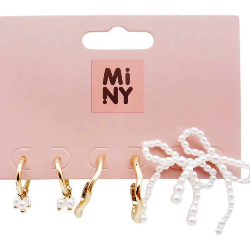 Miny-korvakorusetti sisältää kolme erilaista korvakorua: yhdet rengaskorvakorut helmisomisteilla, yhdet muotoillut rengaskorvakorut sekä yhdet rusetin muotoiset korvakorut helmisomisteilla.