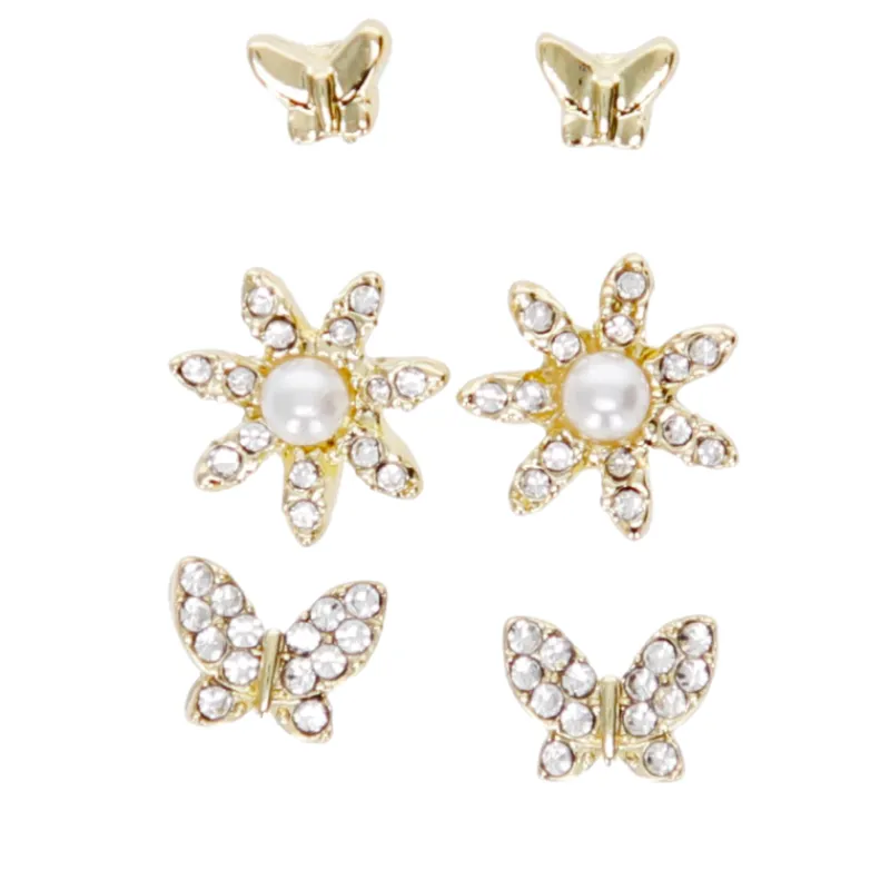 Kolme säihkyvän kaunista nappikorvakoruparia, joissa perhos- ja kukkakuviota.