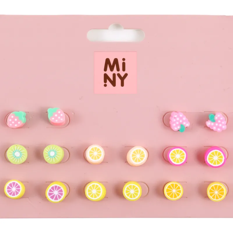 Miny-korusetti sisältää kahdeksan erilaista nappikorvakoruparia herkullisilla hedelmäfiguureilla. Lävistettävät ja nikkeli-vapaat.