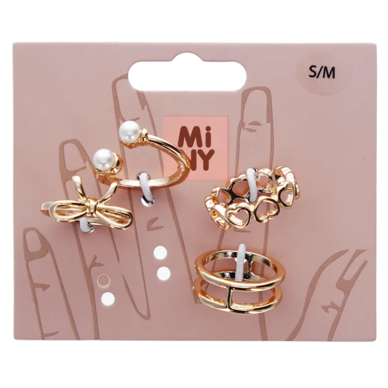 Kullanvärinen sormussetti tuo ripauksen ylellisyyttä ja monipuolisuutta asukokonaisuuteen. Sormukset on helppo yhdistää toisiinsa tai käyttää erikseen, jotta voit luoda ainutlaatuisen tyylin. Sormuksissa teemoina rusetti, helmikoriste, sydän ja rengas.