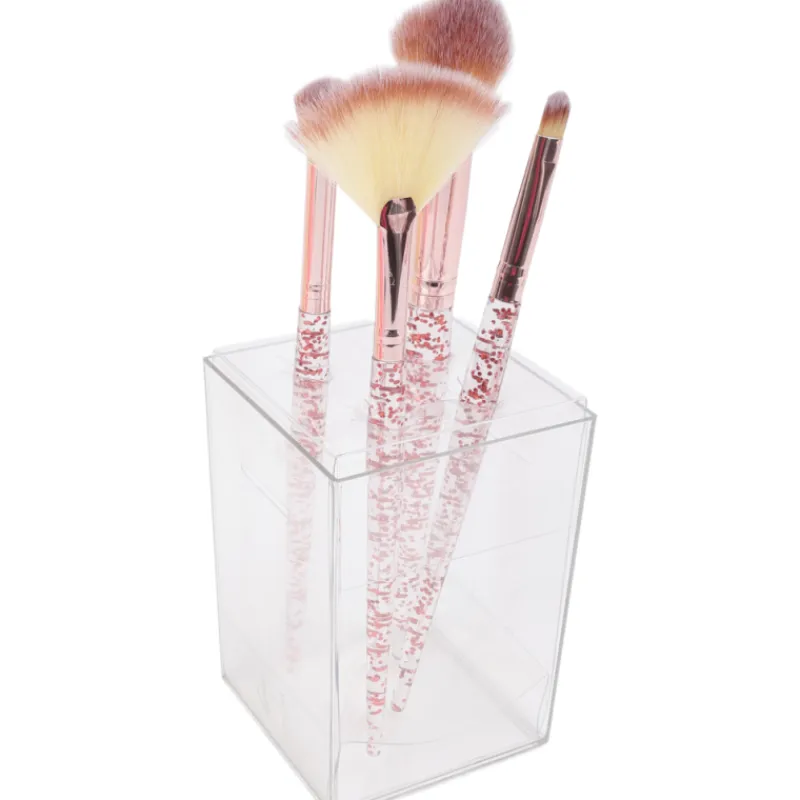 Lisää ripaus suloisuutta meikkipöydällesi tällä ihanalla setillä: neljä glitterkoristeista meikkisivellintä juuri niille sopivassa laatikossa. Laatikko pitää siveltimet kauniisti esillä ja helposti saatavilla, jotta voit nauttia meikkaushetkistäsi vaivattomasti ja tyylikkäästi.
