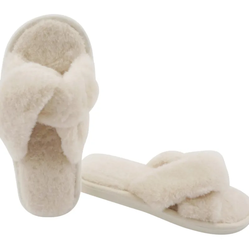 Pehmeät pörrösandaalit on helppo ja mukava sujauttaa aamulla jalkaan. Aamutossuissa kaunis solmukoriste.
