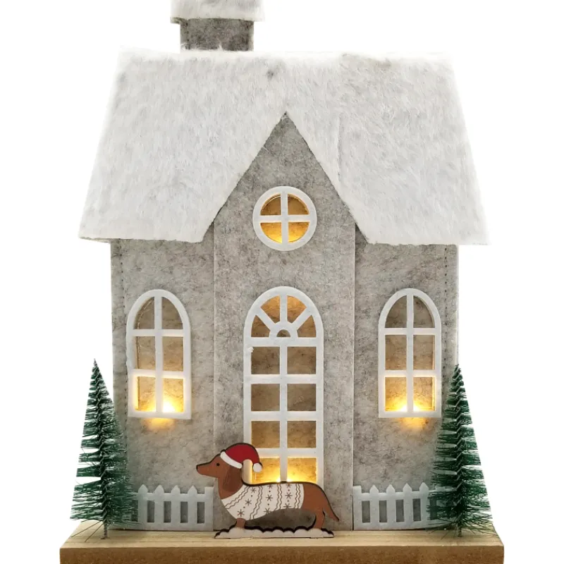 Huopainen talolyhty LED-valoilla luo kaunista tunnelmaa mihin tahansa tilaan. Tuikkutalo on koristeltu joulukuusilla ja talon edessä on jouluisasti pukeutunut mäyräkoira.