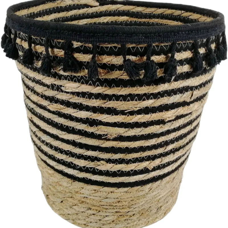Hapsuilla koristeltu raidallinen Miny-säilytyskori on hurmaavan bohohenkinen säilytysratkaisu.