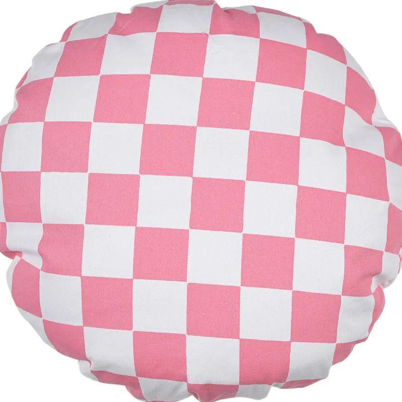 Pyöreä ruutukuvioitu Miny-koristetyyny on pirteä lisä sisustukseen.