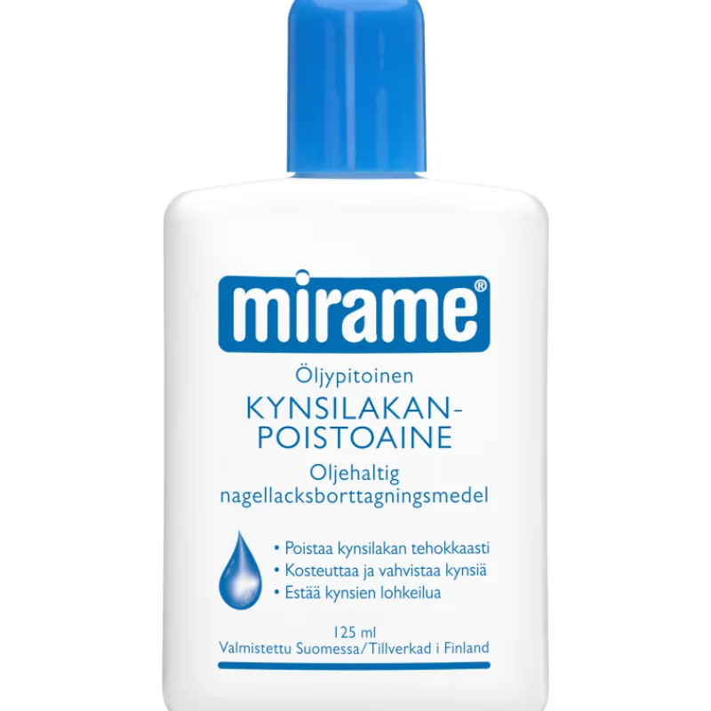 Öljypitoinen Mirame kynsilakanpoistoaine poistaa kynsilakan hellävaraisen tehokkaasti. Kollageenia sisältävä kynsilakanpoistoaine kosteuttaa ja vahvistaa kynttä. Samalla se ehkäisee kynsien lohkeilua. Suomessa valmistettu kynsilakanpoistoaine on sinivalkoinen klassikkotuote. Sisältää asetonia. Pakkauskoko 125 ml.