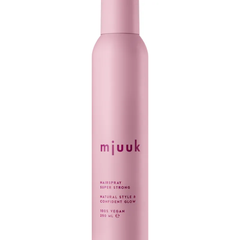 Mjuuk Hairspray Super Strong -hiuslakka antaa kampaukselle erittäin vahvan ja pitkäkestoisen pidon. Hiuskiinne kuivuu ihanan nopeasti ja pitää kampauksen paikallaan koko päivän ajan. Koostumus sisältää kosteussuojan, joka auttaa pitämään pörröisyyden loitolla.