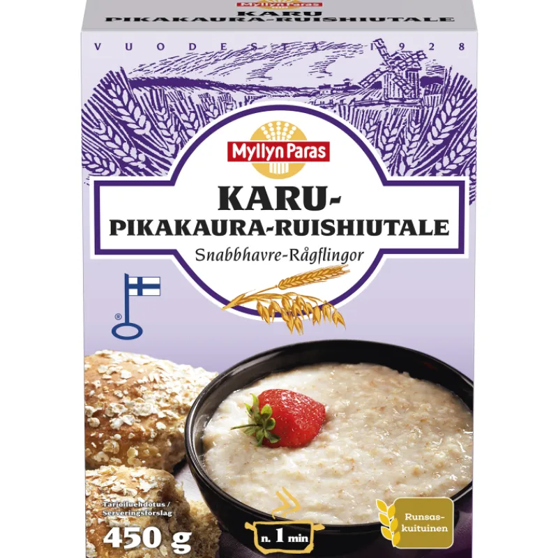 Myllyn Paras KARU Pikakaura-Ruishiutale on runsaskuituinen hiutalesekoitus, joka sopii hyvin puurojen ja jälkiruokien valmistukseen. Pikakaura-Ruishiutale valmistetaan kauran- ja rukiinjyvistä, jotka leikataan, esikypsytetään ja litistetään ohuiksi hiutaleiksi. Sopii myös käytettäväksi sellaisenaan esimerkiksi viilin, jogurtin tai myslin sekaan.