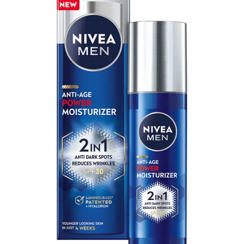 Kosteuttava miesten Anti-Age 2in1 Power Moisturizer -kasvovoide yhdistää hyaluronihapon ja patentoidun pigmenttiläiskiä vähentävän ainesosan Luminous630. Voide ehkäisee pigmenttiläiskiä, vaalentaa tummia läiskiä ja antaa iholle anti-age-vaikutuksen. Suojakerroin 30 antaa suojaa auringolta ja sen aiheuttamilta haittavaikutuksilta.
