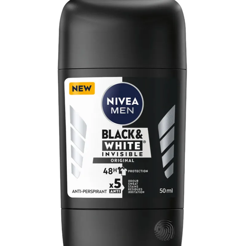 Nivea Men Black & White Invisible Original Deo Stick -antiperspirantti antaa 48 tunnin suojan hikoilua vastaan tahraamatta vaatteitasi. Antiperspirantti suojaa mustia vaatteita valkoisilta jäljiltä ja ehkäisee keltaisten tahrojen syntymistä valkoisiin vaatteisiin – musta pysyy mustana ja valkoinen valkoisena pidempään. Kaksi aktiivista antiperspiranttiainesosaa sisältävässä antiperspirantissa on hellävarainen, hoitava koostumus ja miellyttävä, maskuliininen tuoksu.