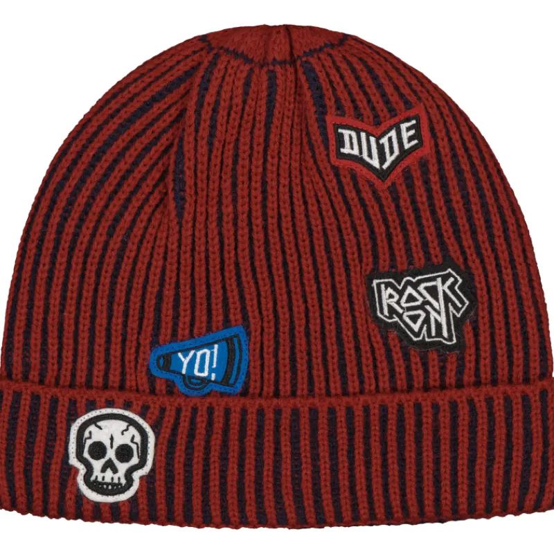 Isompien lasten noixx Rock-neulepipo hauskoilla kangasmerkkisomisteilla. Päällisen materiaalina on 100 % akryyliä, sisäpuolella on pehmeä ja lämmin vuori.