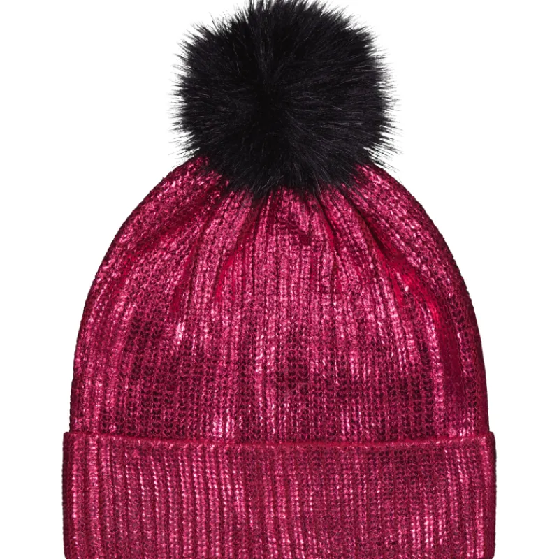 Metallinhohtoisesti kiiltävä kuosi, jossa on tekoturkistupsu somisteena. Väri punainen.