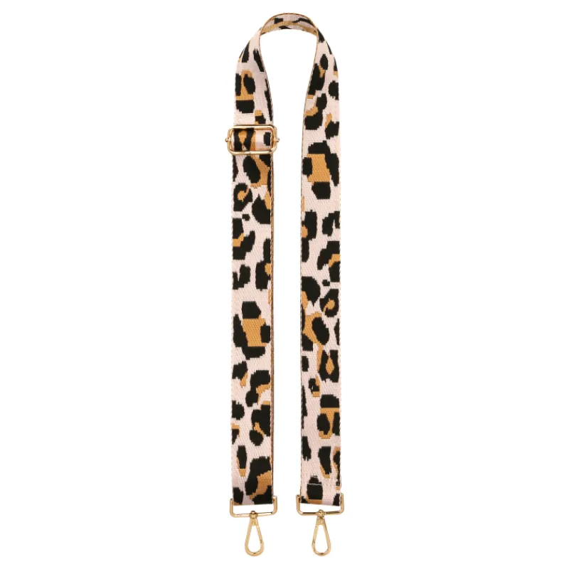 Leveässä, säädettävässä olkahihnassa on laukkuun kiinnitettävät kullanväriset klipsit ja vaaleanpunainen/kulta/musta leopardi-kuosi.