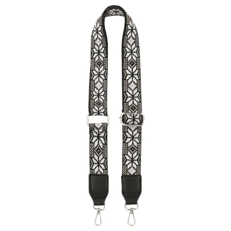 Leveässä, säädettävässä olkahihnassa on laukkuun kiinnitettävät hopeanväriset klipsit ja musta/valkoinen/harmaa kuvio-kuosi.