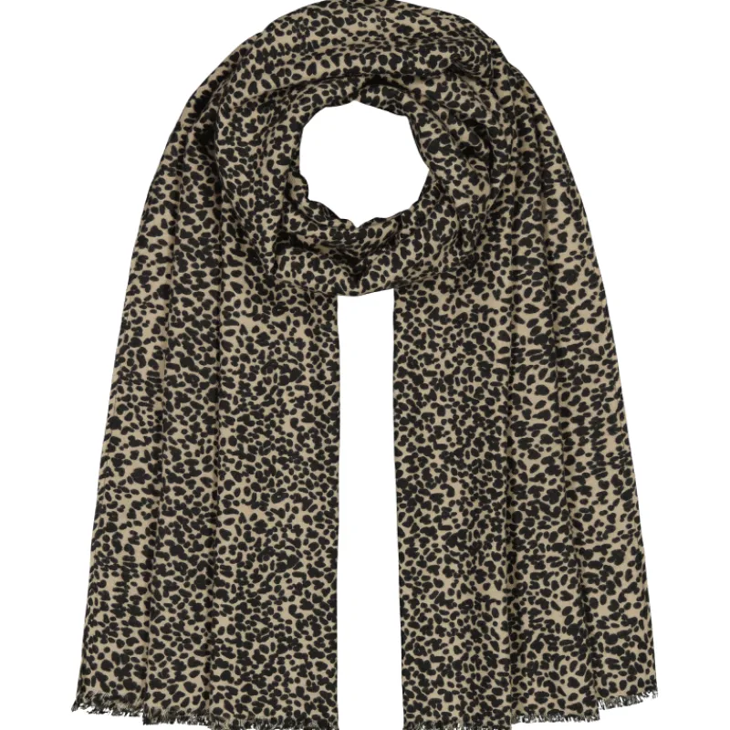 Naisten noixx Mila-huivi lyhyillä päätyreuna-hapsuilla ja kivalla eläin-printtikuosilla. Väri ruskea/beige.