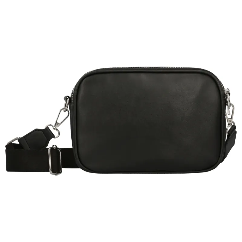 Suorakaiteen muotoisessa kassissa on kaksi tilavaa päälokeroa hopeanvärisellä vetoketjusuljennalla, leveä pohja ja sisäosassa pieni avotasku. Leveän, säädettävän kangas-olkahihnan voi irrottaa tarvittaessa metalliklipsien ansiosta. Mattamusta/hopean värinen kuosi.