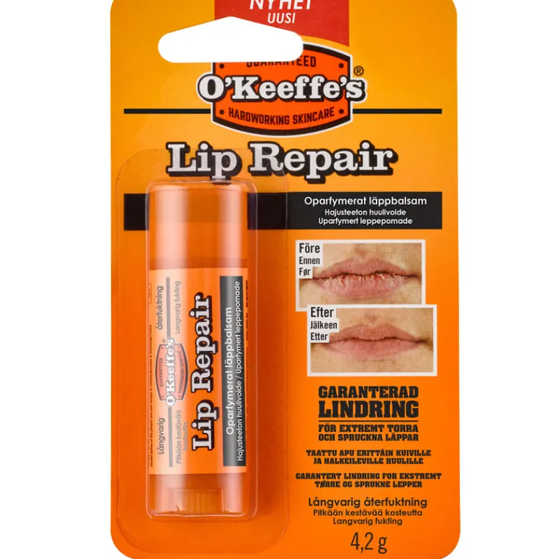 O’Keeffe’s Lip Repair Unscented -huulivoide tarjoaa koko päivän kestävää kosteutta vain yhdellä levityskerralla. Huulirasva muodostaa joustavan suojakerroksen, joka hoitaa ja suojaa kuivia ja halkeilevia huulia. Suoja kestää myös syömisen ja juomisen. Hajusteeton. Pakkauskoko 4,2 g.