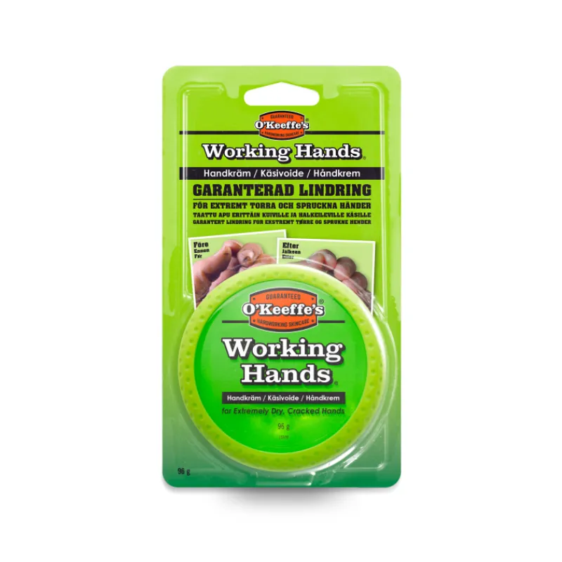 Taattu apu erittäin kuiville ja halkeileville käsille. Working Hands -käsirasva on suunniteltu erityisesti henkilöille, jotka tekevät työtä käsillään. Vahamainen käsivoide kosteuttaa ja suojaa ihoa mahdollistaen sen paranemisen. Käsivoide on hajuton, rasvaton, eikä tahmaa käsiä. Sopii myös atoopikoille. Käsivoidepurkki 96 g.