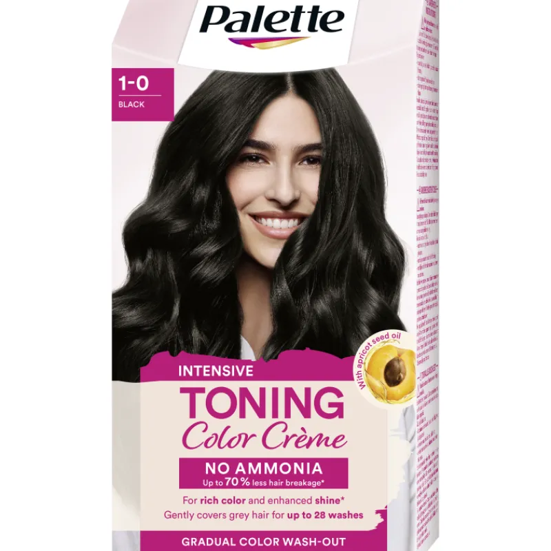 Palette kevytväri luo intensiivisen, kiiltävän ja kauniin luonnollisen värin, joka haalenee pesussa tasaisesti minimoiden näkyvän juurikasvun. Täyteläinen kevytväri kestää jopa 28 pesua. Ammoniakiton koostumus vähentää hiusten katkeilua värjäyksen aikana. Sävy: 1-0 Black.