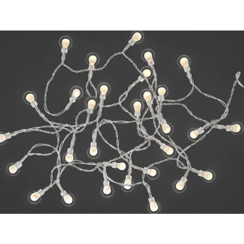 SOLAR LED-valonauha Kupla -aurinkokennovalaisimessa on yhteensä 30 lämpimän valkoista LED-valoa. Toiminta-aika täyteen ladattuna jopa 6-8 tuntia*. Johdon pituus aurinkopaneelilta 2 m ja valojen etäisyys 10 cm. Valaisimen akku latautuu auringonvalossa ja valo syttyy automaattisesti hämärän tultua.