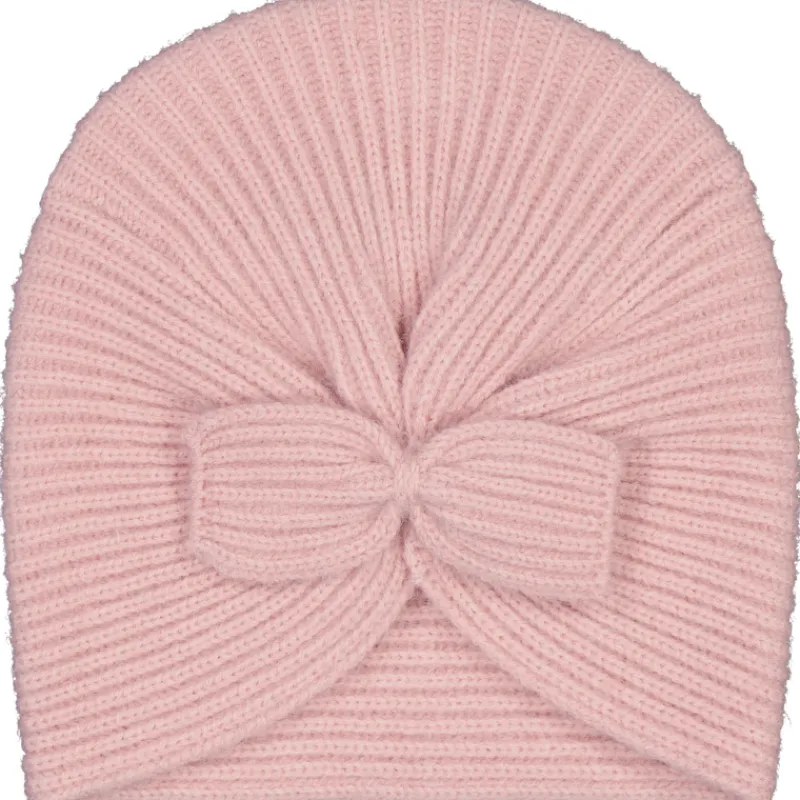 Yksikerroksinen myssy on ribbineuletta. Keskellä oleva rusetti-detalji kiinnittyy somasti poimutettuun etukappaleeseen. Väri vaaleanpunainen.