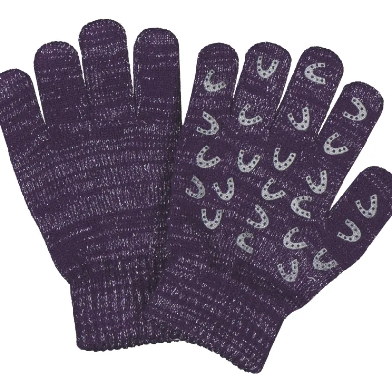 Neulesormikkaissa on sileä neule, resori yläreunassa. Hopeanvärisellä langalla meleerattu lila kuosi, johon on printattu hevosenkenkä-kuvioita.