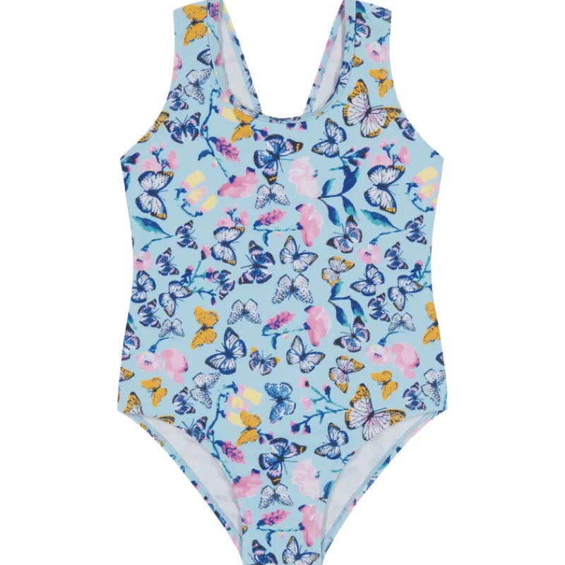 Pienten lasten Peuhu Taimi-kokouimapuku painijanselkä-mallilla ja suloisella Perhoset-kuosilla. Materiaalina on kierrätettyä polyesteriä sekä elastaania.