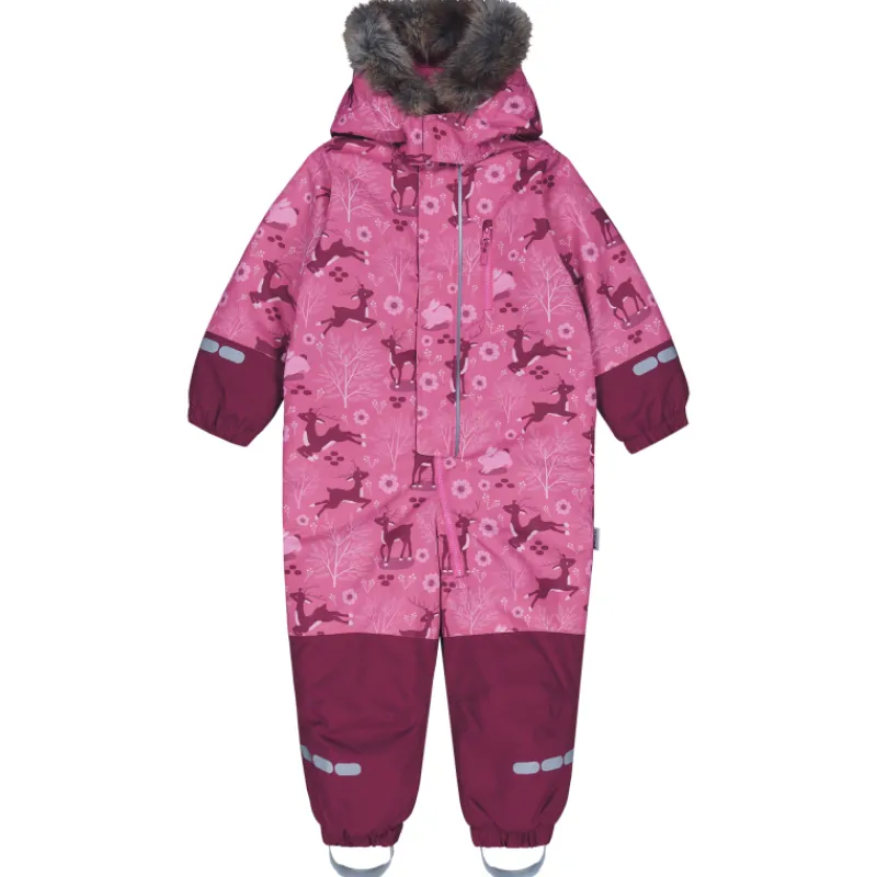 Vedenpitävä ja hengittävä lasten toppahaalari, jonka irrotettavassa hupussa on irrotettava tekoturkisreunus. Haalari on kuvioitu kauniilla bambikuosilla.